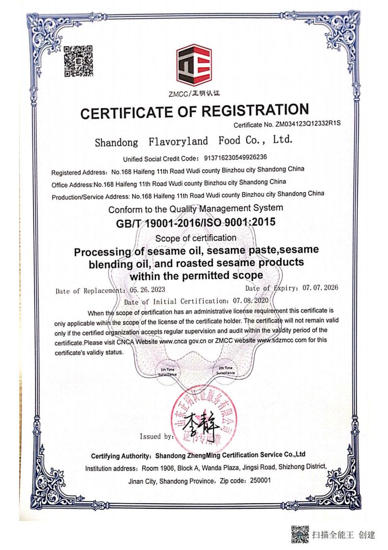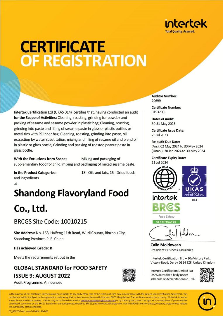 ? ? 豐香園小磨香油、芝麻調(diào)和油、花生醬、芝麻醬、混合醬、熟芝麻制品均已通過英國零售商協(xié)會BRC認(rèn)證、歐盟 美國和國內(nèi)有機(jī)、HACCP體系認(rèn)證,是山東省出口食品備案企業(yè)。
